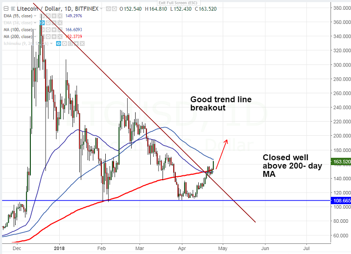 - LTC/USD has broken major resistance 150 (200- day MA) and jumped till 164.55 after a 70% decline from temporary top around $370 made on Dec 19th 2017 high. The pair has formed major double bottom around 106 and shown a good jump of more than 40% and is currently trading around 163.50.