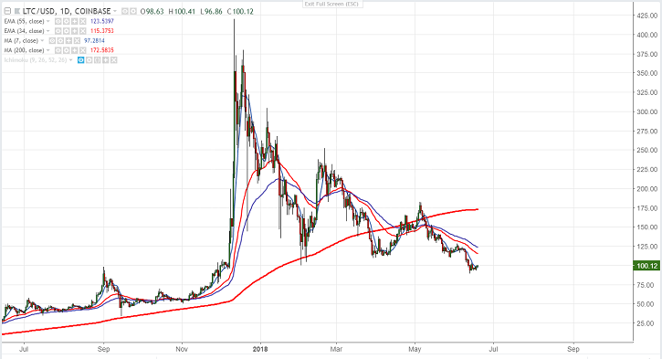 - LTC/USD has shown a minor jump after hitting low of $89.25. The pair declined more than 50% from the temporary top $182.35. It is currently trading around $100. It has declined more than $20 in previous week. It has declined almost 79% from the all-time high of $370.