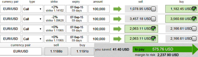Therefore, buying 2M (+2%) Out-Of-The-Money (strikes at 1.1412) 0.34 delta call, buy another 2M (-2%) In-The-Money (strikes at 1.0964) 0.67 delta call and simultaneously sell 2 lots of 2M At-The-Money calls with positive theta values. All the positions should be early September maturities. As the delta on butterflies would usually be zero, this option combination should also be close to zero.