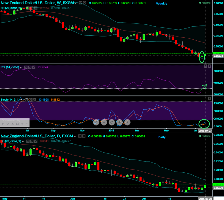 RSI on weekly chart is converging upward at 29.9322, while %K line crossover on slow stochastic curve is seen below 20 levels which is oversold zone. (Currently, %K line trending at 13.6232 and %D line at 6.9151). Overall, Kiwi dollar after a long lasted losing streak that was started from last 1 year or so to hit almost 6 year's lows has now changed its direction. So far the major trend was downtrend dominated by the bears and now has been trend reversal signalled by technical indicators.