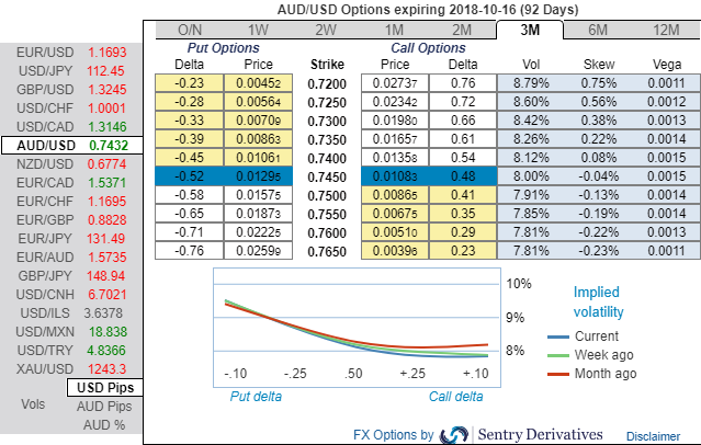 As you can observe hedging bids for OTM put strikes upto 0.72 levels (above nutshell), the underlying spot FX seem to be discounting above-stated fundamental driving forces. While bearish neutral delta risk reversal also indicates that the hedging activities for the downside risks remain intact.