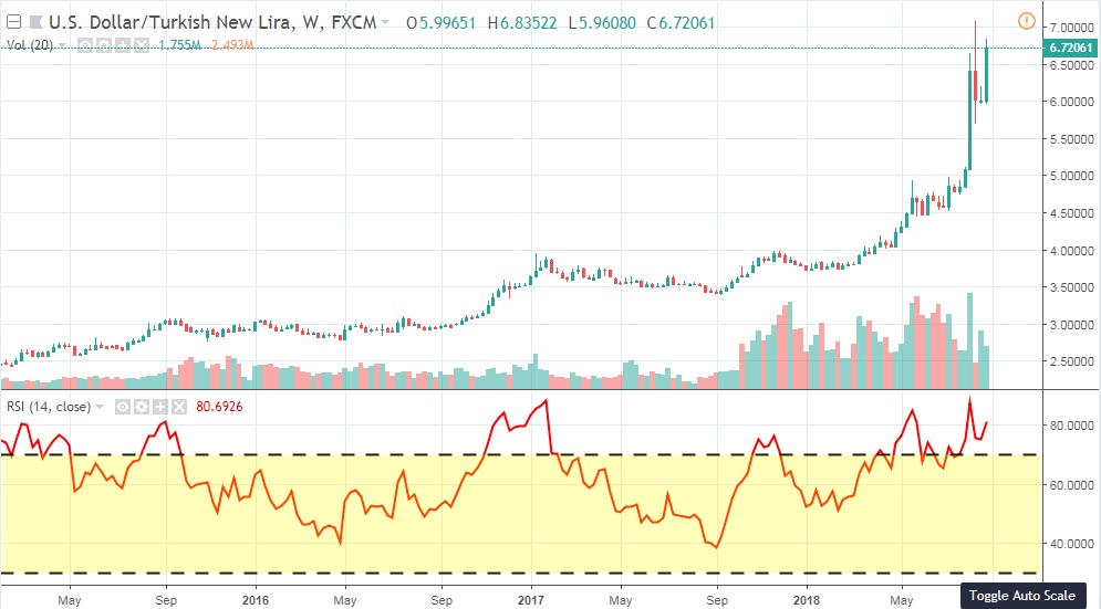 After strengthening to as low as 5.69 per USD two weeks before, the Turkish Lira has once again resumed its rapid decline against the dollar. As of today, Lira is trading at 6.77 per USD, and our calculations suggest the Lira bears are aiming for 7.5 per USD as the next target.