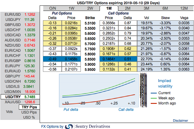 Trade tips: 3m USDTRY debit call spreads are advocated with a view to arresting upside risks. Initiate 3m 5.30/6.54 call spreads at net debit. Thereby, one achieves hedging objective as the deep in the money call option with a very strong delta will move in tandem with the underlying spikes.