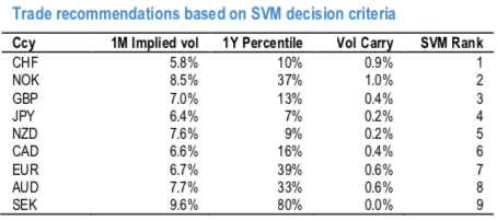 With individual G10 currency SVM models in hand we rank USD/G10 vols based on estimate of success in vol shorting (refer 2nd chart).