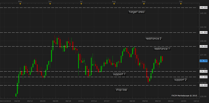 - Buy Euro against Yen at current price (136.3), with target around 146 and stop around 132.
