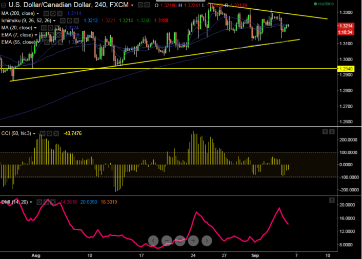 USD/CAD is trading in narrow range 1.3325 and 1.3125 for the past three trading session. Any trend reversal can happen only above or below the channel.