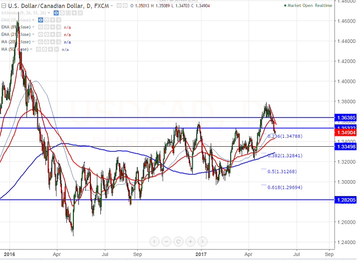 - USD/CAD formed a temporary top around 1.37935 on May 5th 2017 and started to decline from that level. The pair breaks below major support at 1.3480 (50 day MA) and declined till 1.3470. Any close below 50- day MA confirms that decline till 1.3410. Any break below 1.3410 confirms that jump from 1.2964 comes to an end and dip till 1.3285 (200- day MA) likely.