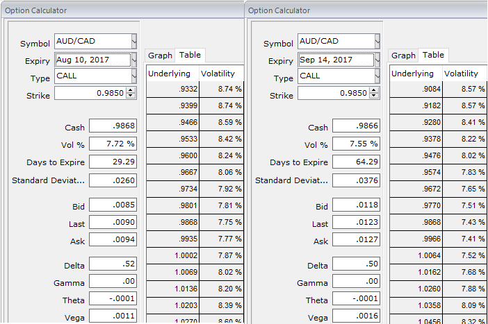Alternatively, relative value constructs involving buying AUD puts/CAD calls vs. selling USD puts/CAD calls(live, no delta-hedge) appeal as low-cost ways of assuming exposure to the same directional dynamic.
