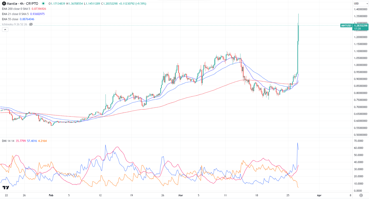 MNTUSD prices surged more than 80% in the past five days. It hit a high of $1.3670 and is currently trading around $1.2860. The pair is holding above the short-term (21 and 55-day EMA) and above the long-term moving average (200-day EMA).