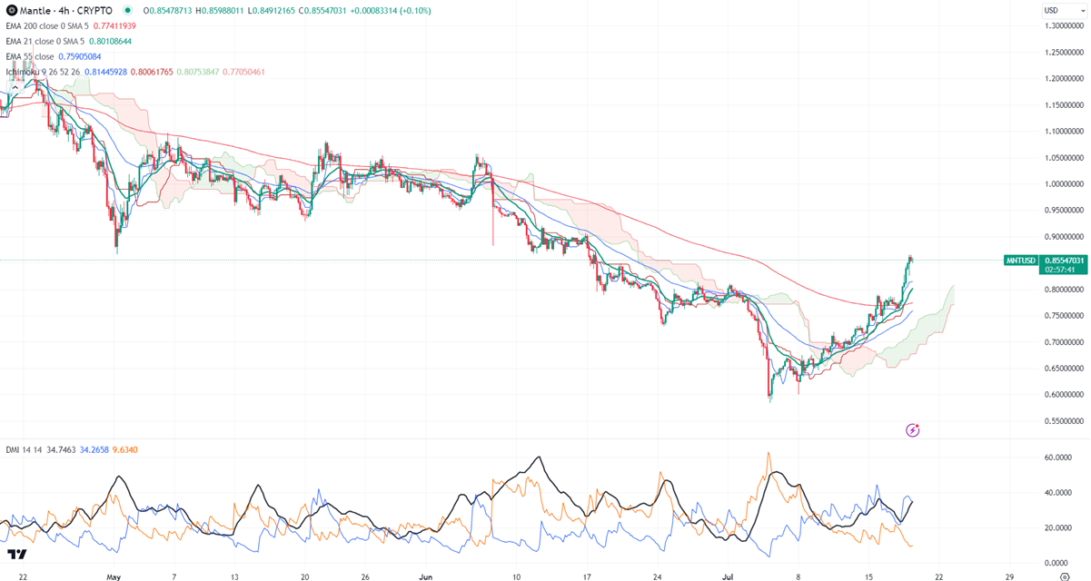 MNTUSD prices trading higher for the past two weeks and surged more than 45%.It hit a high of $0.865 and is currently trading around $0.855. The pair is holding above the short-term (21 and 55-day EMA) and above the long-term moving average (200-day EMA).