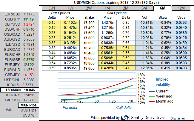 Please be noted that the negatively skewed implied volatilities of USDMXN of 6m tenors indicate neutral hedging sentiments (refer above diagram).
