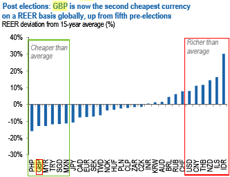 iii) Cheap GBP valuations on some longer-term metrics. The additional 1.5% weakening in GBP in response to the election has made GBP the second cheapest currency globally on an REER basis (refer above chart).