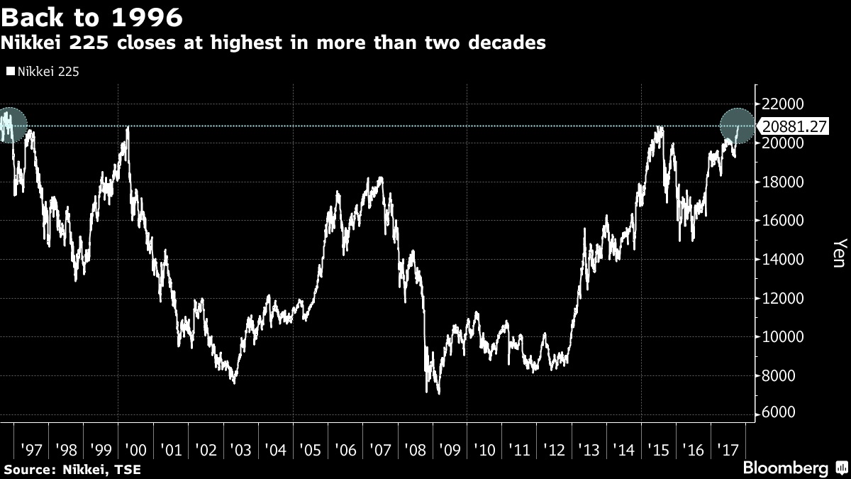 The Japanese benchmark stock index Nikkei 225 reached the highest level in more than two decades in today’s trading. Nikkei closed at 20881 today, which is the highest level for the index since December 1996.