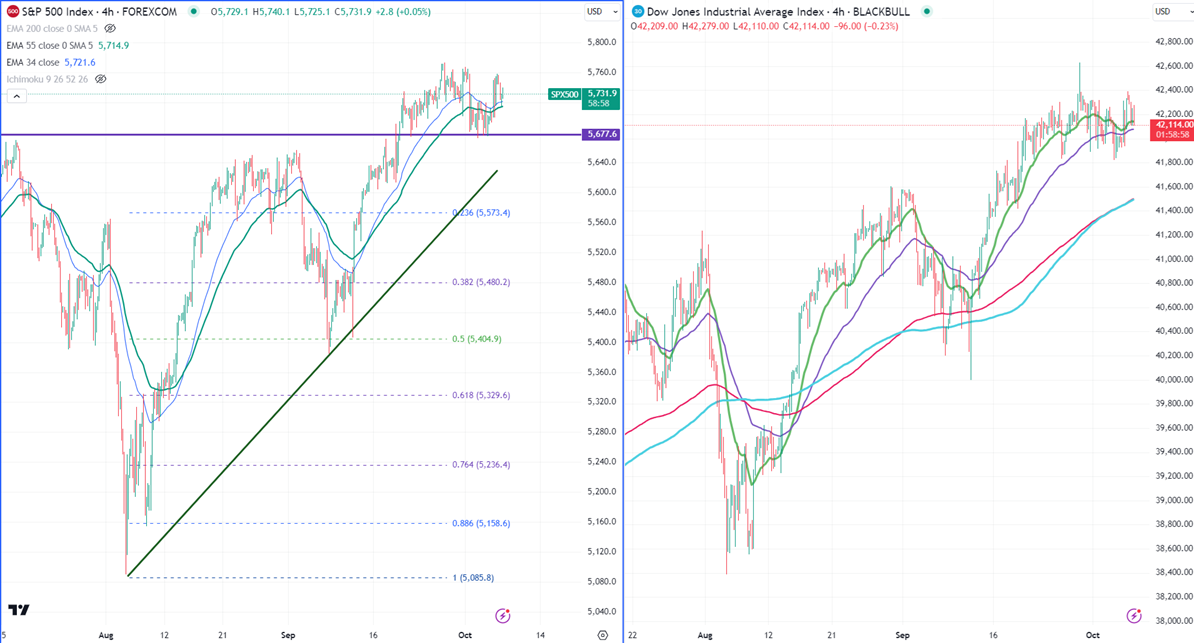 The pair holds below short-term (34, 55 EMA) and long-term (200 EMA) in the 4-hour chart.