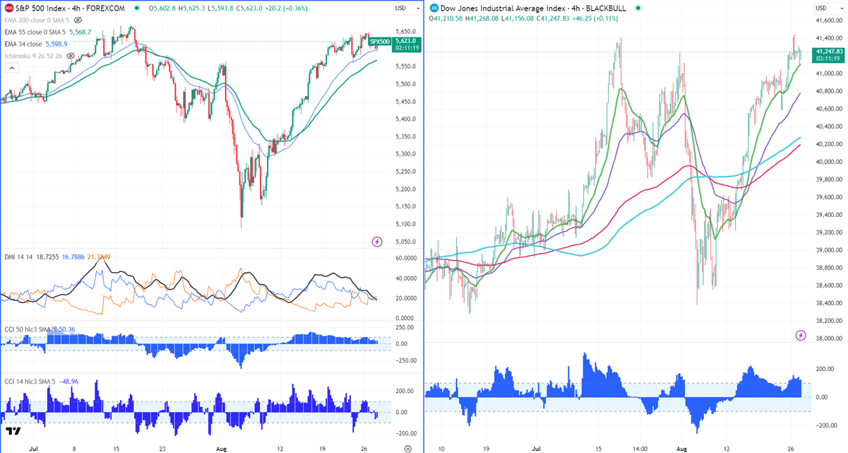 The pair holds above short-term (34, 55 EMA) and long-term (200 EMA) in a 4-hour chart.