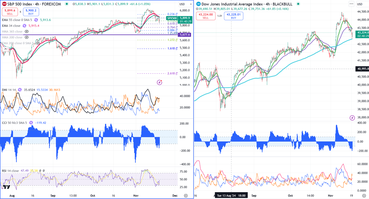 In the 4-hour chart, the pair holds below the short-term (34, 55 EMA) and long-term (200 EMA) EMAs.