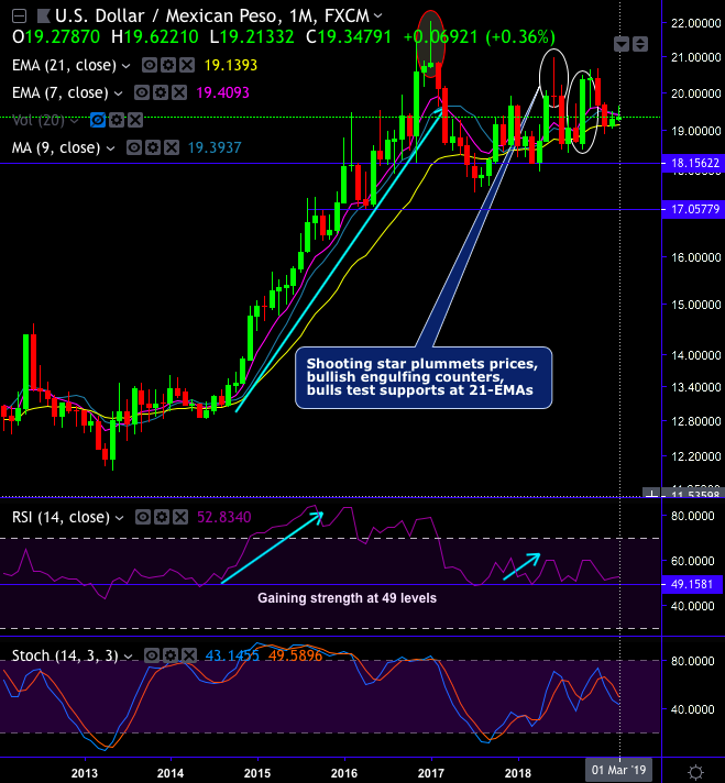 Technically, USDMXN forms shooting star at 19.90 that plummets prices below EMAs, on the contrary, bullish engulfing popped-up at 20.3405 levels to counter previous bearish swings, bulls now test supports at 21-EMAs and currently trading at 19.3400 levels with bullish sentiments.