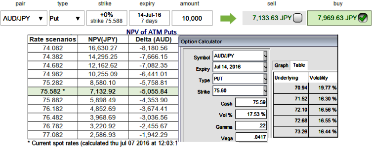 As we expect the underlying currency exchange rate of AUDJPY to make a larger move on the downside. As shown in the figure purchase 1M 2 lots of At-The-Money -0.52 delta puts and sell 1W one lot of (1%) In-The-Money put option.