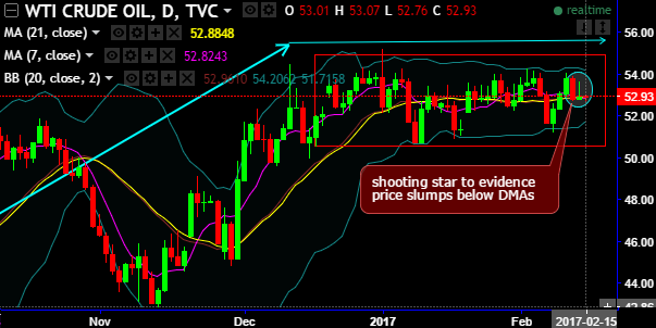 On daily terms, the shooting star is traced out at 53.01 levels to evidence the price slumps below DMAs.