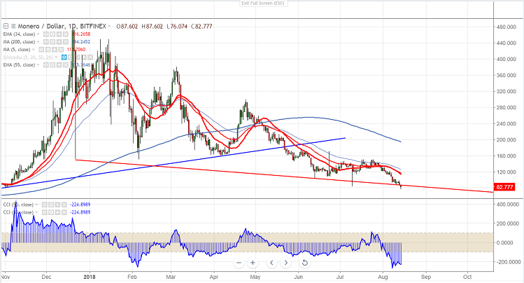 XMR declined continuously from the minor top of $151.95 till $76 almost more than $70. The pair is trading slightly below trend line support.