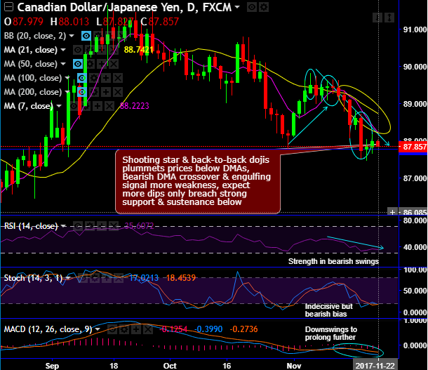 On a broader perspective, the prices are now attempting bounce but restrained below 21EMA levels (i.e. 88.1763 levels) and head towards wedge baseline, thereby, one could expect more slumps as both the leading oscillators have been constantly converging downwards to signal weakness (refer monthly chart).