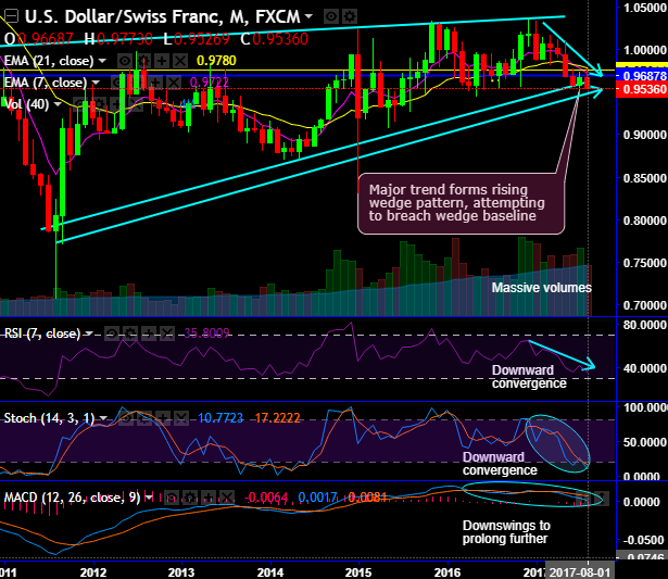 If it manages to break below strong support decisively at wedge baseline at 0.9566 levels on a closing basis (which seems most likely), then expect more slumps as MACD still signal most likely extension of slumps.