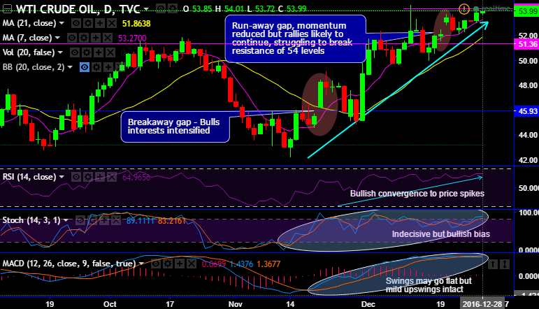 The current prices are well DMAs, for now, the break above 51.36 levels evidences bullish environment with a gap up patterns to substantiate this bullish stance, but the upswings are struggling to break resistance of 54 levels, but all chances of the trend to head towards $55 levels are quite visible again with the minor hic-ups.