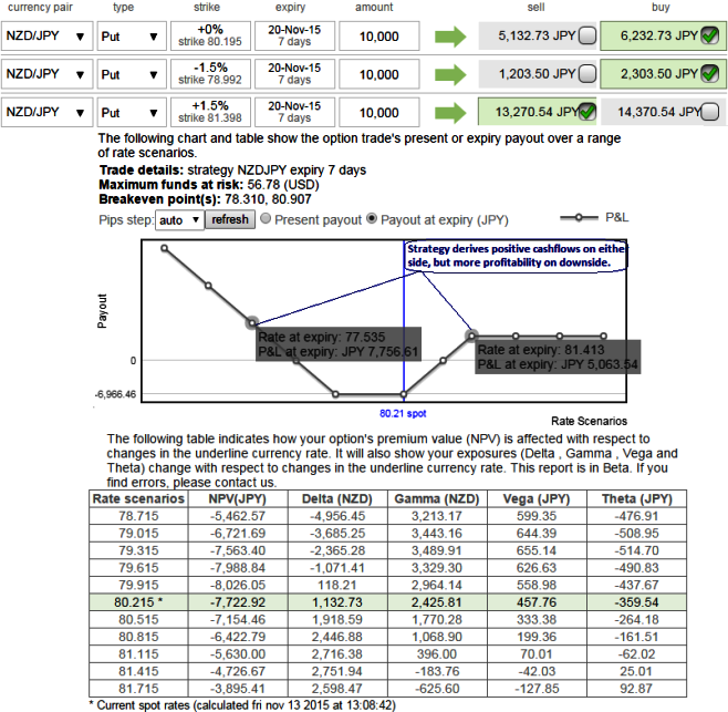 Maximum returns are limited to the extent of initial credit received if the NZDJPY rallies above the upper breakeven point (BEP) but large unlimited profit can be achieved should the underlying exchange rate of NZDJPY makes a vivid downswings below the lower BEP.