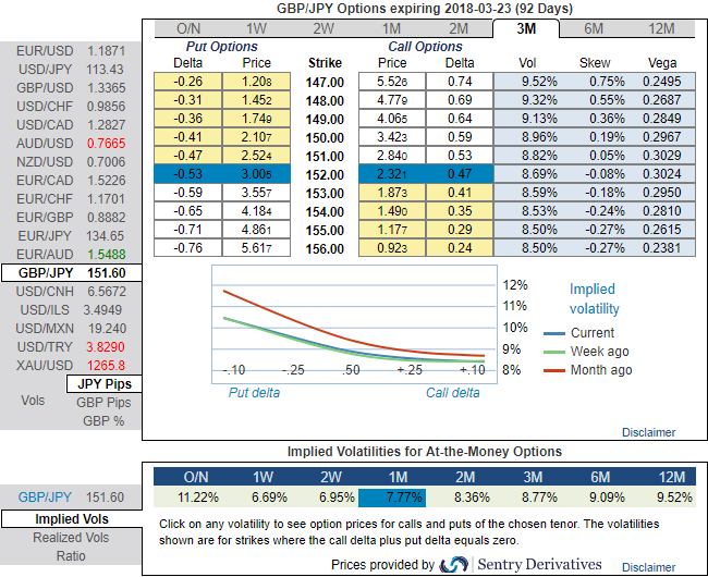 The aggressive volatility investors want to capture GBP should consider buying ATM put instruments and/or being long of the smile convexity, against ATM volatility. Thus, ATM strikes are perceived to be more conducive than the OTMs.