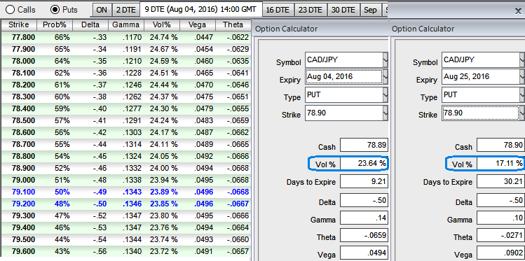 Please be noted that the yen currency crosses have shown a spectacular IV shifts above 20% in 1w expiries and CADJPY has been no exceptions to flash spiking IVs at 23.64% in 1-week expiries amid all these developments, we see healthy vega along with these rising IVs on OTM put strikes. This shows the significance of bearish interest in this pair.