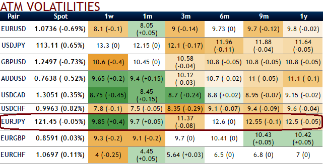 The EURJPY volatility surface is currently offering very attractive shorting opportunities, as ATM volatility is rich and 6m/1y skews are excessively priced. Here, we recommend a couple of trades taking advantage of both the volatility and skew premiums.