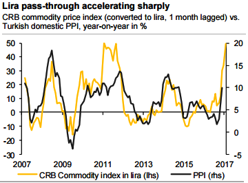 Anyway, what is relevant now is not the historical average pass-through, but what ongoing lira sell-off is doing to import prices today: the above chart explains the YoY change in world commodity prices converted to Turkish lira - this works as a good lead indicator of what domestic manufacturing prices could be doing in coming months.