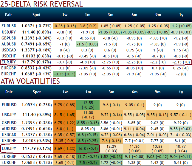 Since EURJPY OTC markets seem to be highly volatile with the extremely bearish environment, and IVs for 1M contracts are the highest among G10 FX space (above 16%). This would be good news for option holders contemplating the prevailing bearish environment but more number of longs in ATM delta puts would ensure the reasonable probabilities in underlying exposures.