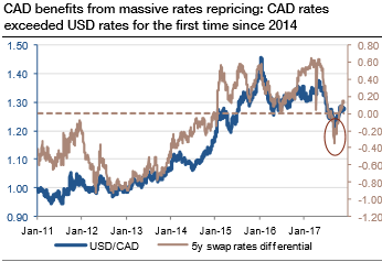 However, the loonie is on the right track to remain strong: the interest rates factor is taking over from the commodity factor. We reiterate that CAD rates recently climbed above USD rates for the first time since 2014 (refer above graph), and USD rates projections can realistically drag the USDCAD to 1.20.