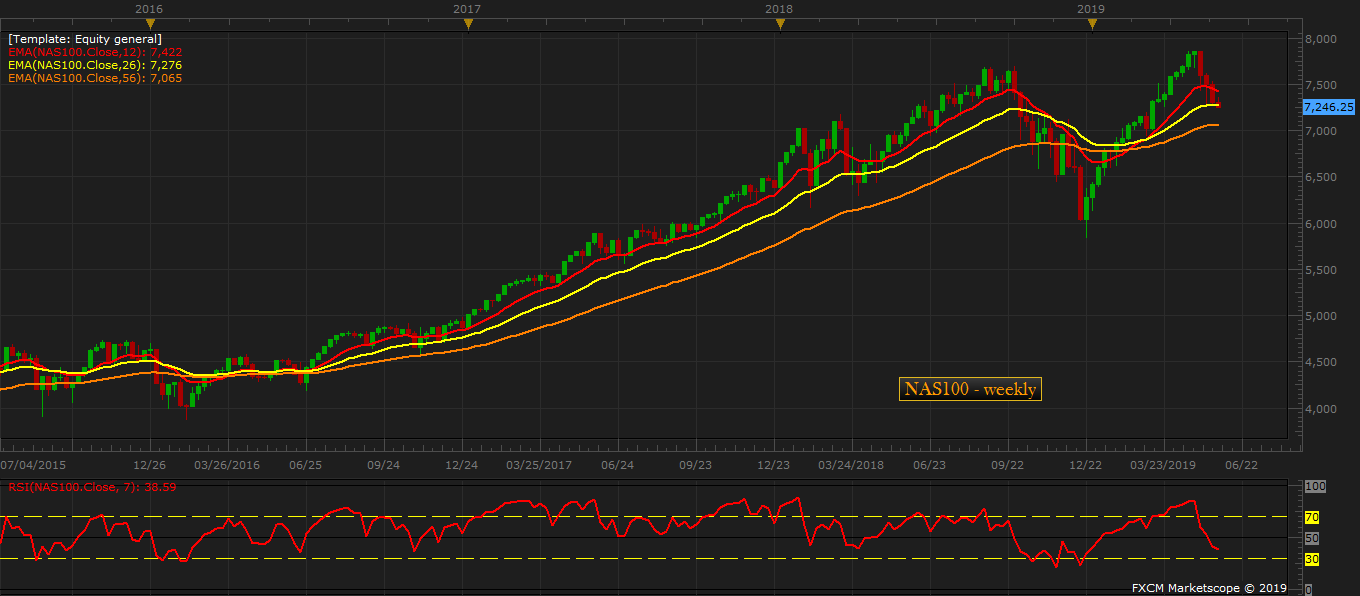 U.S. tech-heavy index, NASDAQ100 to face further decline as China steps up its own effort to counter U.S. tariff of 25 percent on Chinese goods worth $250 billion.
