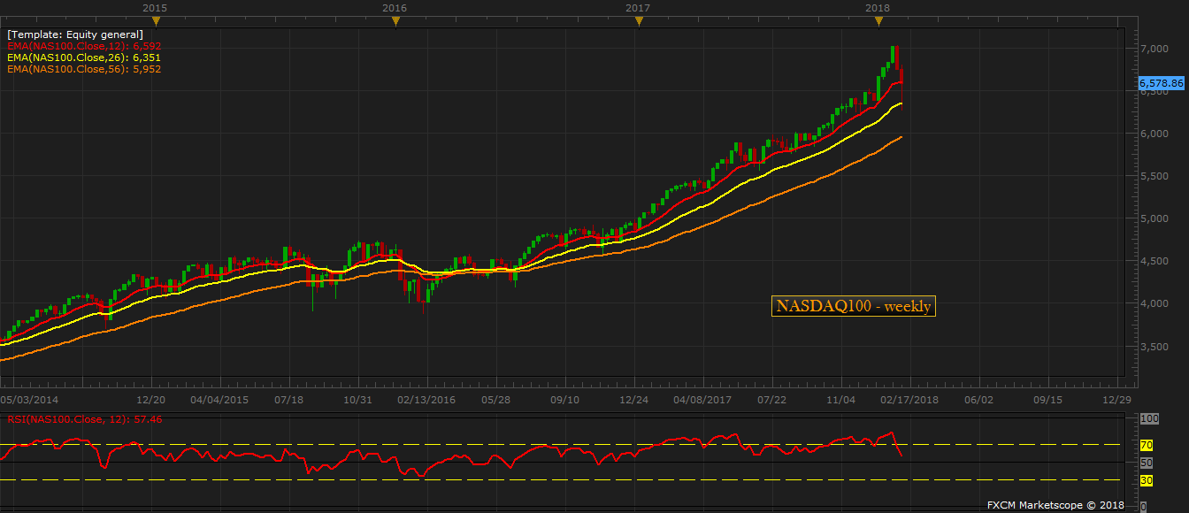 The recent selloff in the global stocks including those in the United States has pushed the tech-heavy NASDAQ100 to as low as 6260 from 7040 area. Over the past two weeks, the index declined more than 11 percent before a bounce back. The index is currently trading at 6580.
