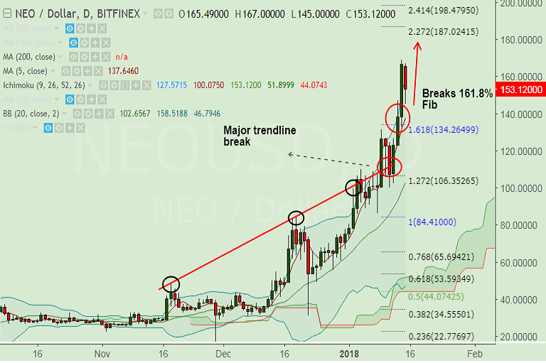 - NEO/USD is seen consolidating break above 161.8% Fib at 134 levels, bias higher.