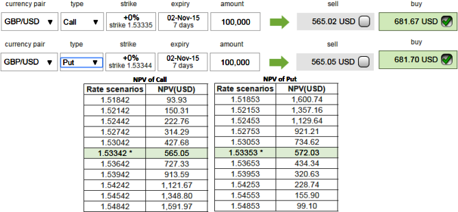 NPV of ATM call - 565.05 while Premiums trading above 20.63% at GBP 681.67 for lot size 100,000 units.