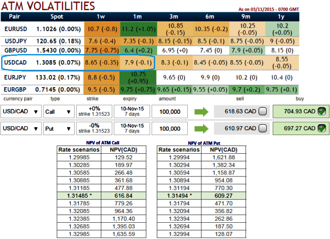 NPV of 1w ATM call is 616.84 while premiums trading above 14.28% at CAD 704.93 for lot size 100,000 units.