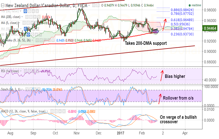 - NZD/CAD has held major support by 200-DMA at 0.9370 and bounced higher to currently trade at 0.9446.