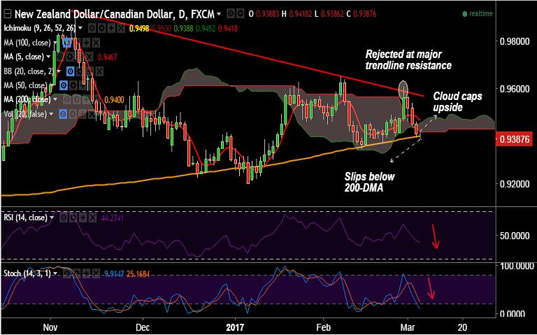 - NZD/CAD has shown a decisive break of 200-DMA at 0.94, building scope for downside.