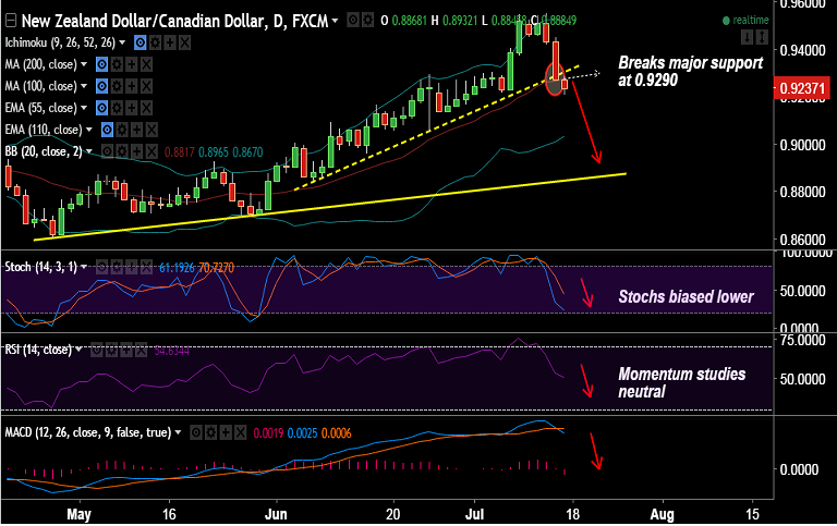 - NZD/CAD has breached major trendline support at 0.9290. Near-trem bias is bearish.