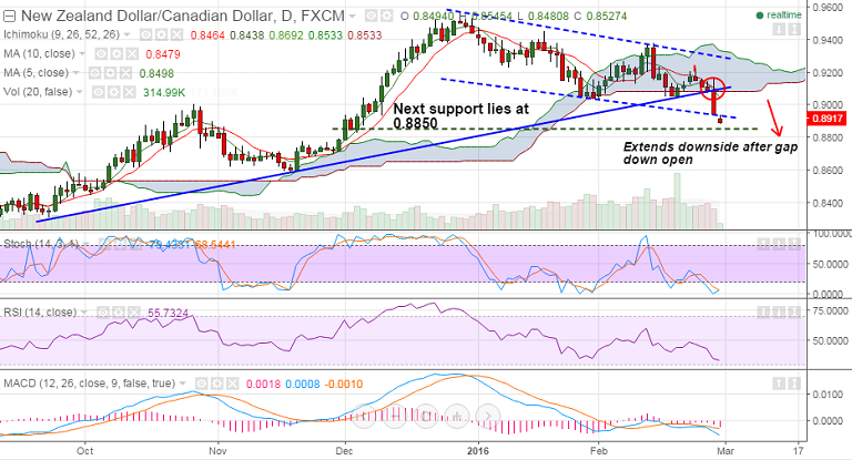 NZD/CAD has broken below strong trendline support at 0.9075 and hit fresh 2-month lows at 0.8887 in today's trade.