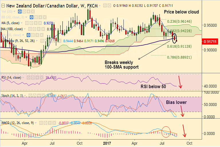 - NZD/CAD has broken major support at weekly 100-SMA at 0.9234 in the previous week.