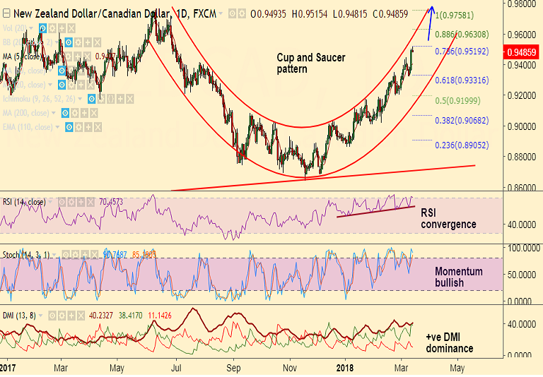 - NZD/CAD has hit fresh 8-month highs at 0.9515 before paring some gains to currently trade at 0.9481 levels.