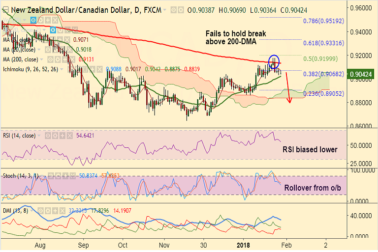 Support levels - 0.9018 (20-DMA), 0.9001 (Jan 17 low), 0.8905 (23.6% Fib retrace of 0.9758 to 0.8641 fall)