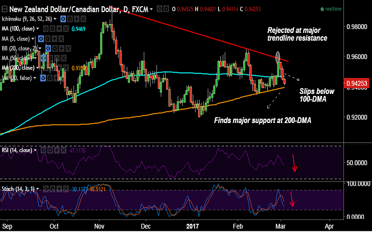 - NZD/CAD has broken below 100-DMA support at 0.9469, intraday bias lower.