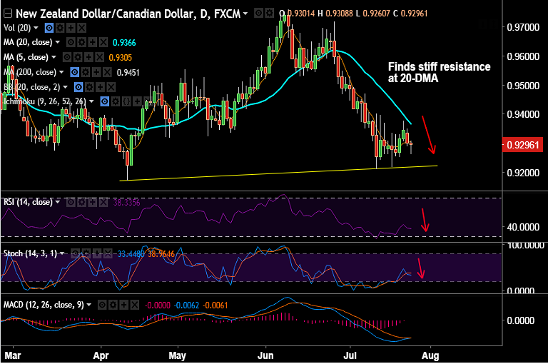 - NZD/CAD finds stiff resistance at 20-DMA at 0.9366, bias lower.
