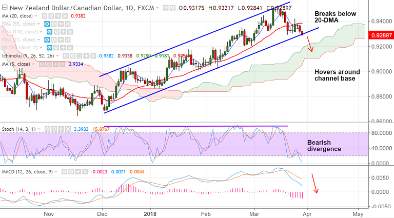 - Price has broken below 20-DMA and break below channel base finds next support at 50-DMA at 0.9250.