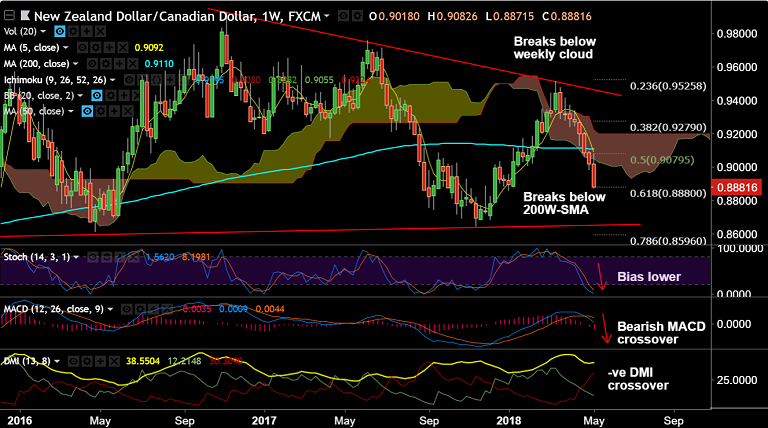 - NZD/CAD trades with a bearish momentum, we see scope for further weakness.